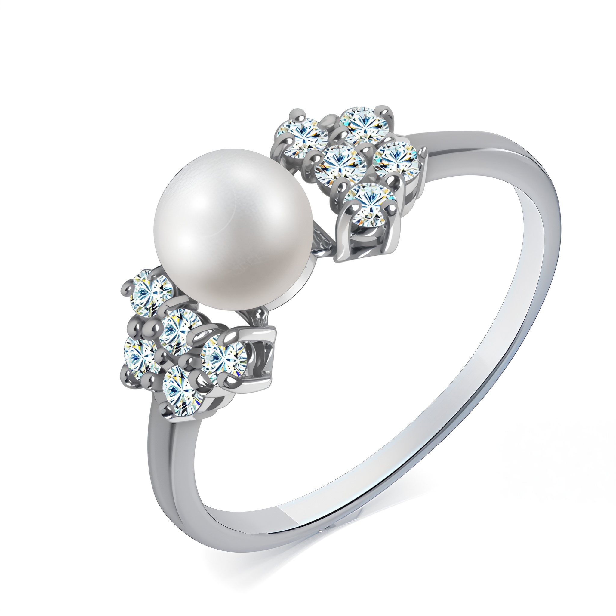 Кольцо из серебра 925 пробы с искусственным жемчугом и фианитами